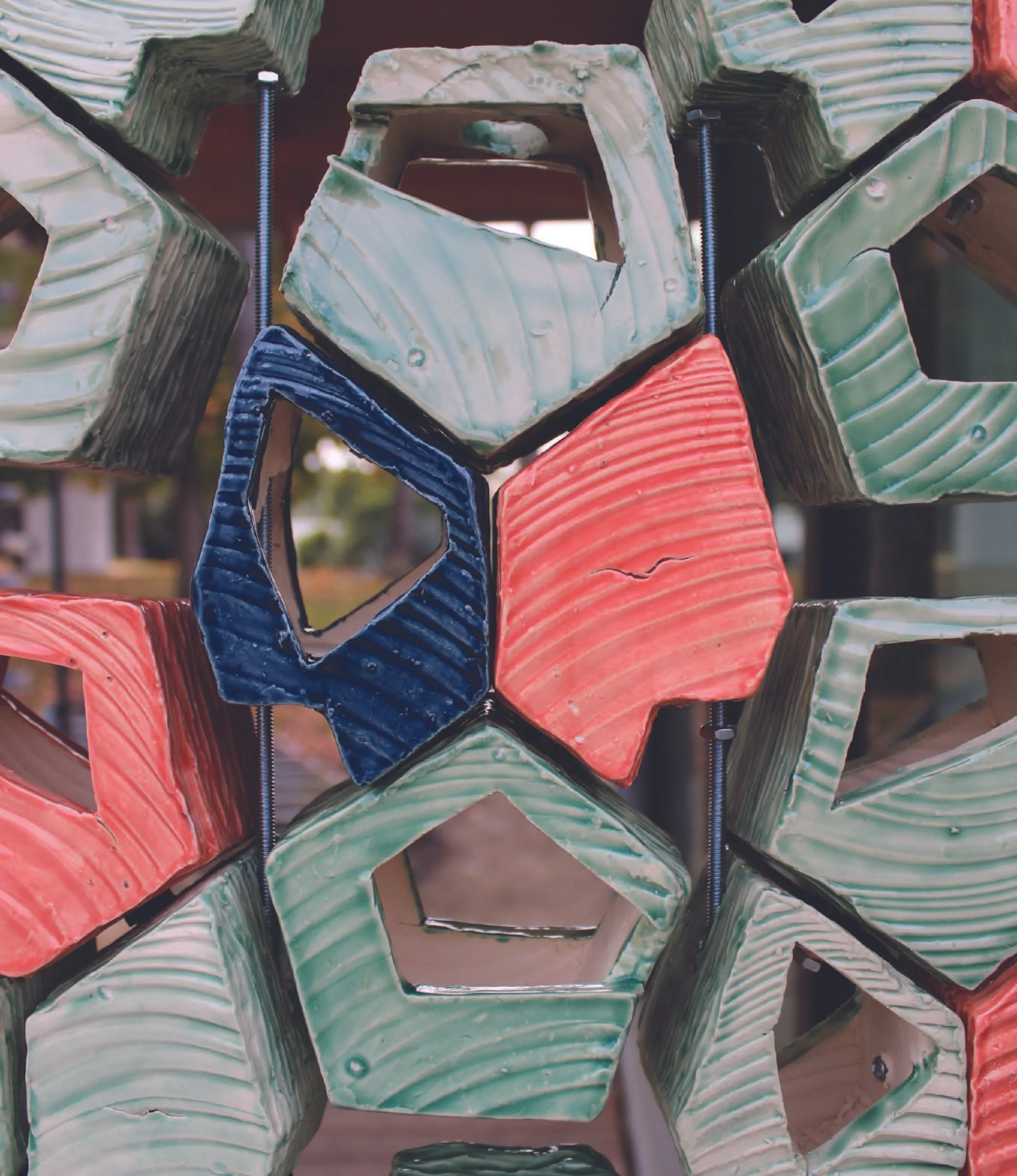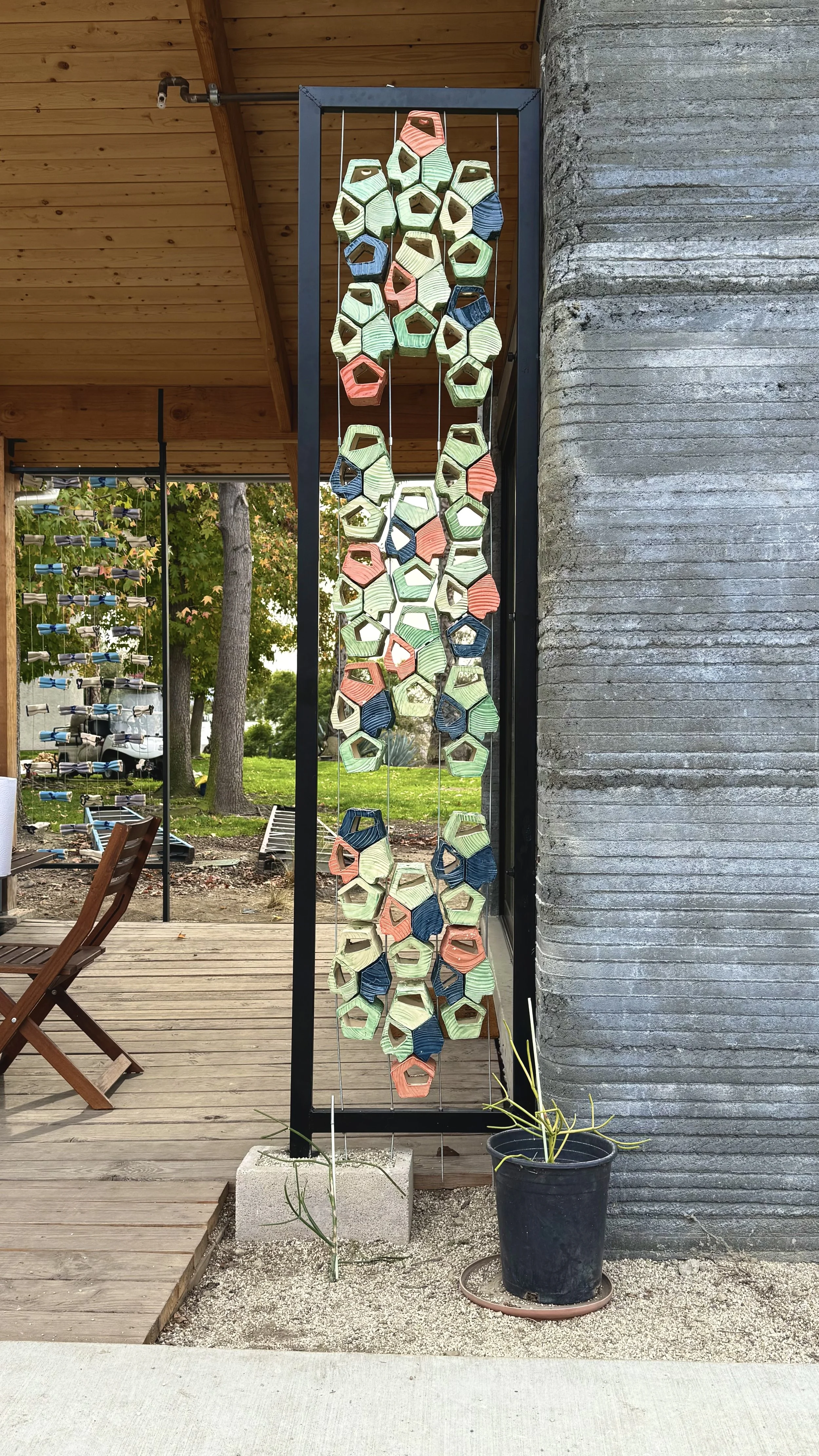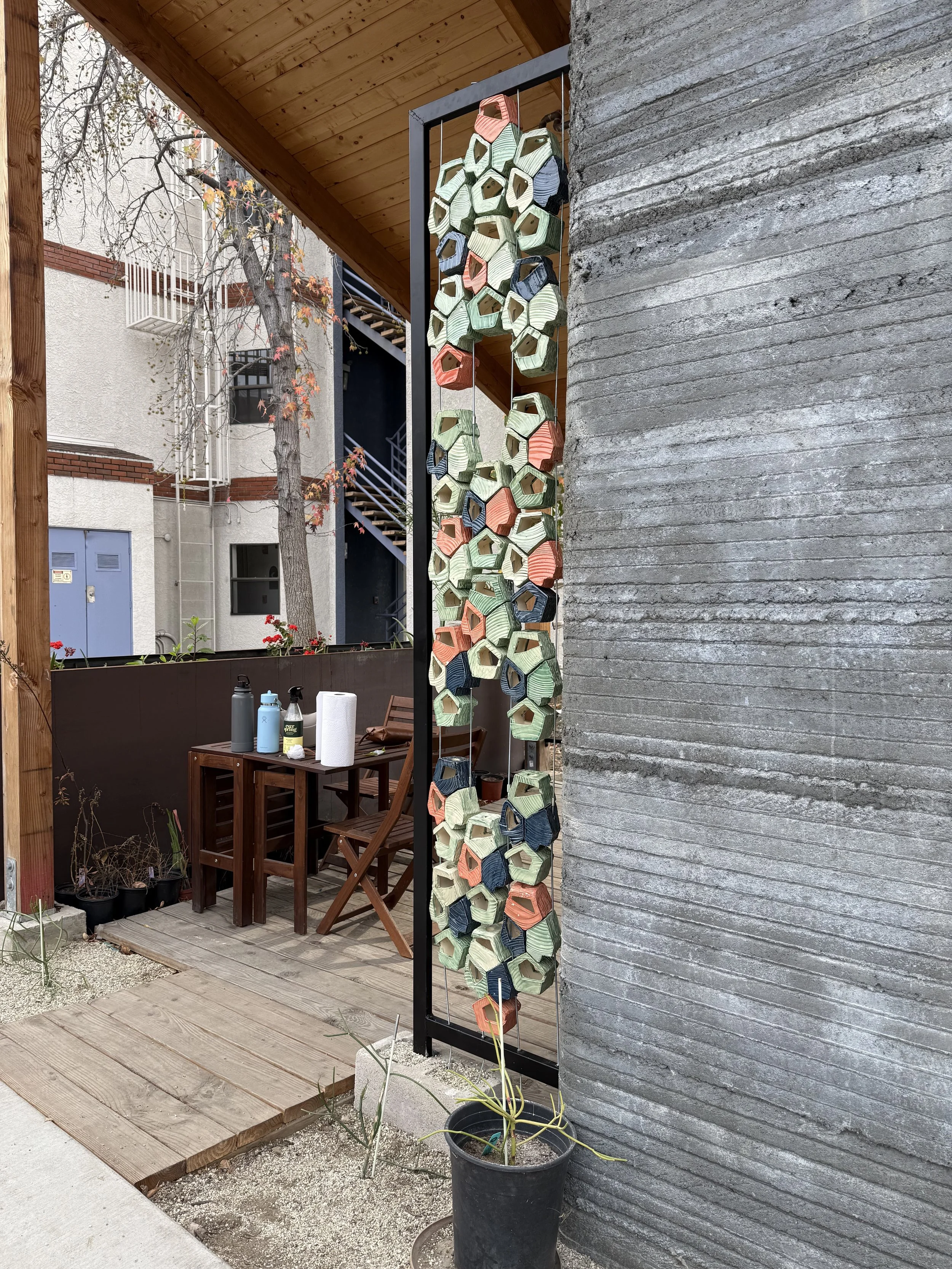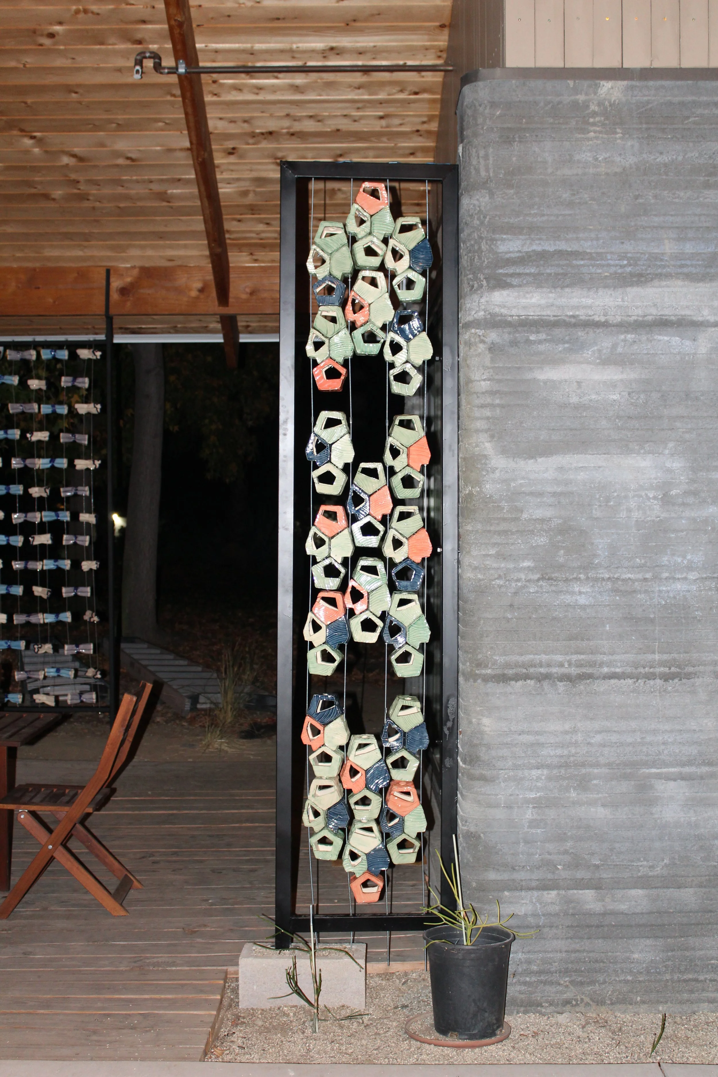 The modular clay screen wall at Woodbury University’s Solar House enhances the entry planter with both sculptural and functional qualities. Standing 8 feet tall, the wall consists of mega modules, each made from four smaller micro modules. These micro modules are extruded and hand-textured on all sides, creating dynamic surfaces that play with light and shadow.