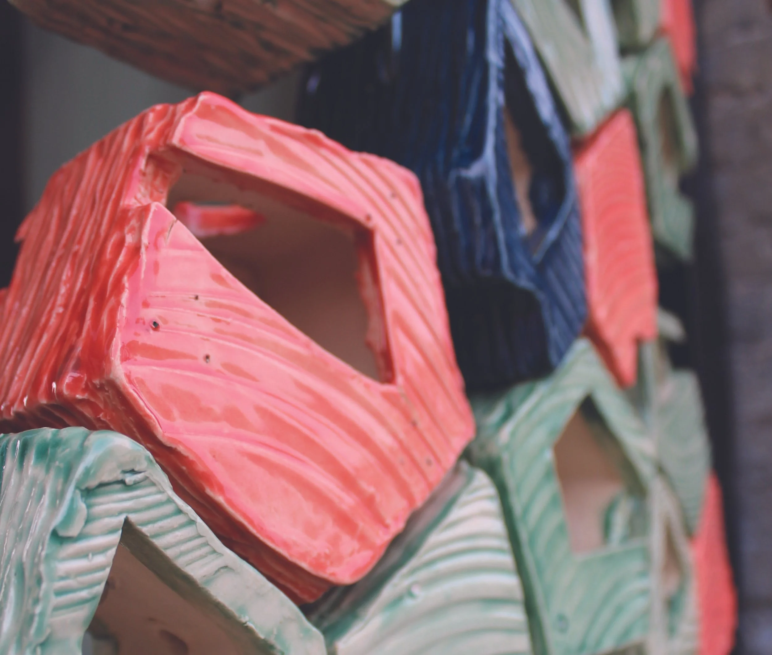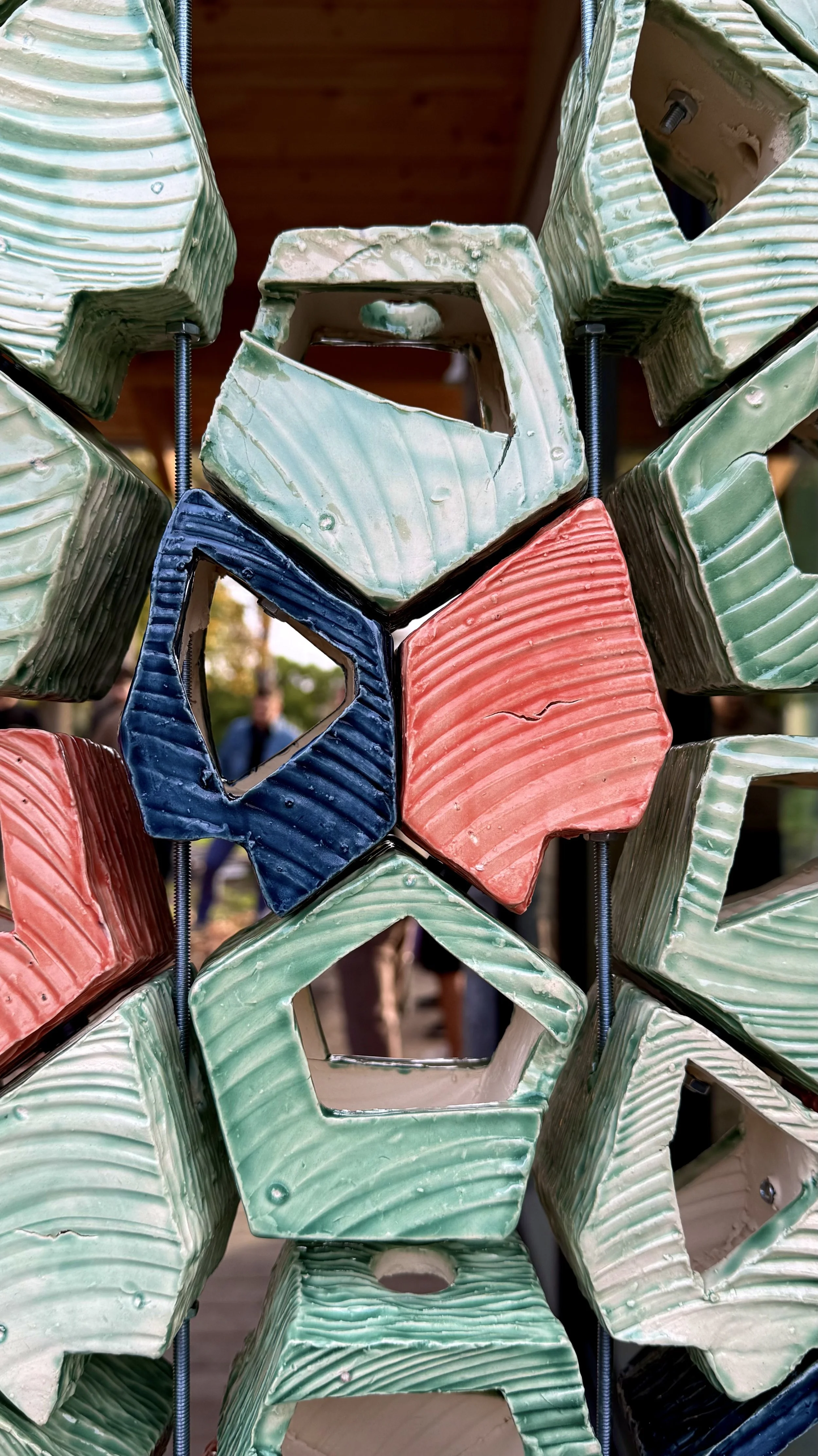 Glazed in green, blue, and pink, the modules form a gradient that reflects natural transitions, complements the landscape, and embodies the house’s sustainable ethos. The blue glaze echoes the concrete’s tone, while the coral adds a vibrant accent. Bolted together with threaded rods for stability, the wall can be easily installed or disassembled, reflecting the project’s adaptive, ecofriendly design.